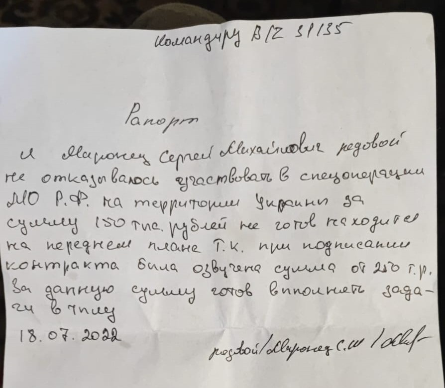 Рапорт от солдата таманской дивизии. Жалуется говорит подписывался на войну за 250000 рублей, а за 150000 рублей идти вперед умирать в Украине не готов. Судьба писателя не известна, таманская дивизия получила мзды под Изюмом от 93 бригады "Холодний Яр" ВСУ.
