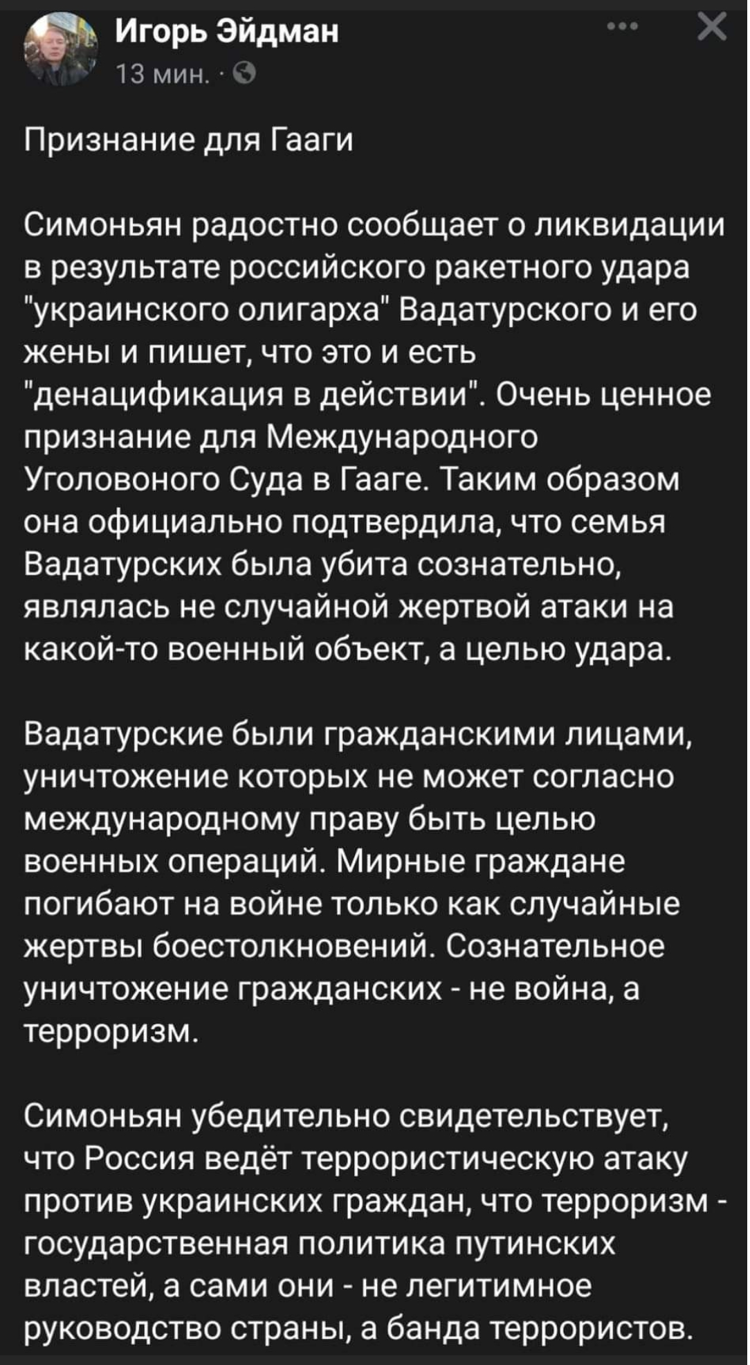 УП підтвердили інформацію, що російський снаряд потрапив у будинок Вадатурського, загинула також його дружина.