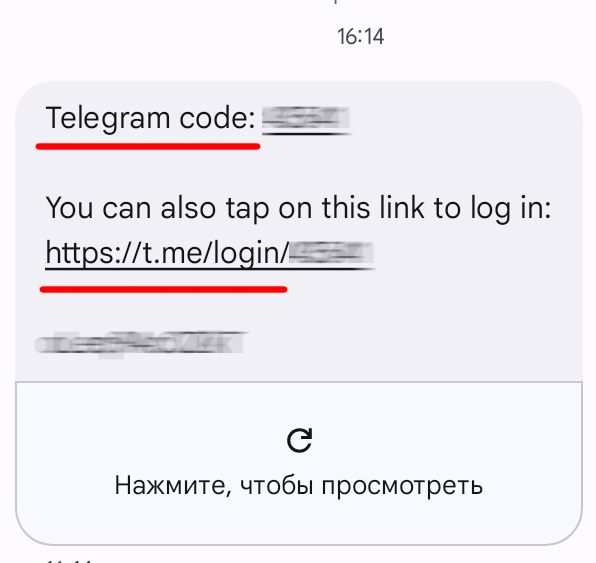 3. Однако предположим, что у вас под рукой нет Телеграма. Что может сделать злоумышленник? Заказать отправку SMS на ваш номер, чтобы подтвердить вход в новую копию Телеграма. И вам придет вот такая SMS, из которой тоже хорошо видно, что это код Телеграм для входа в другом приложении.