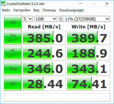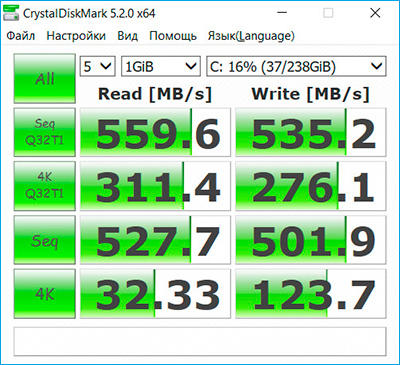 У современных SSD скорости, если безо всяких ухищрений вроде RAID0 и так далее (с RAID0 скорость увеличивается процентов на 20-30, но тоже совсем не на порядок), обычно и бывают где-то на уровне 500-600 мегов в секунду. А всякие цифры в 4-5 тысяч - это, думал я, небось какой-то кеш-контроллер стоит, который просто искажает результаты измерения.