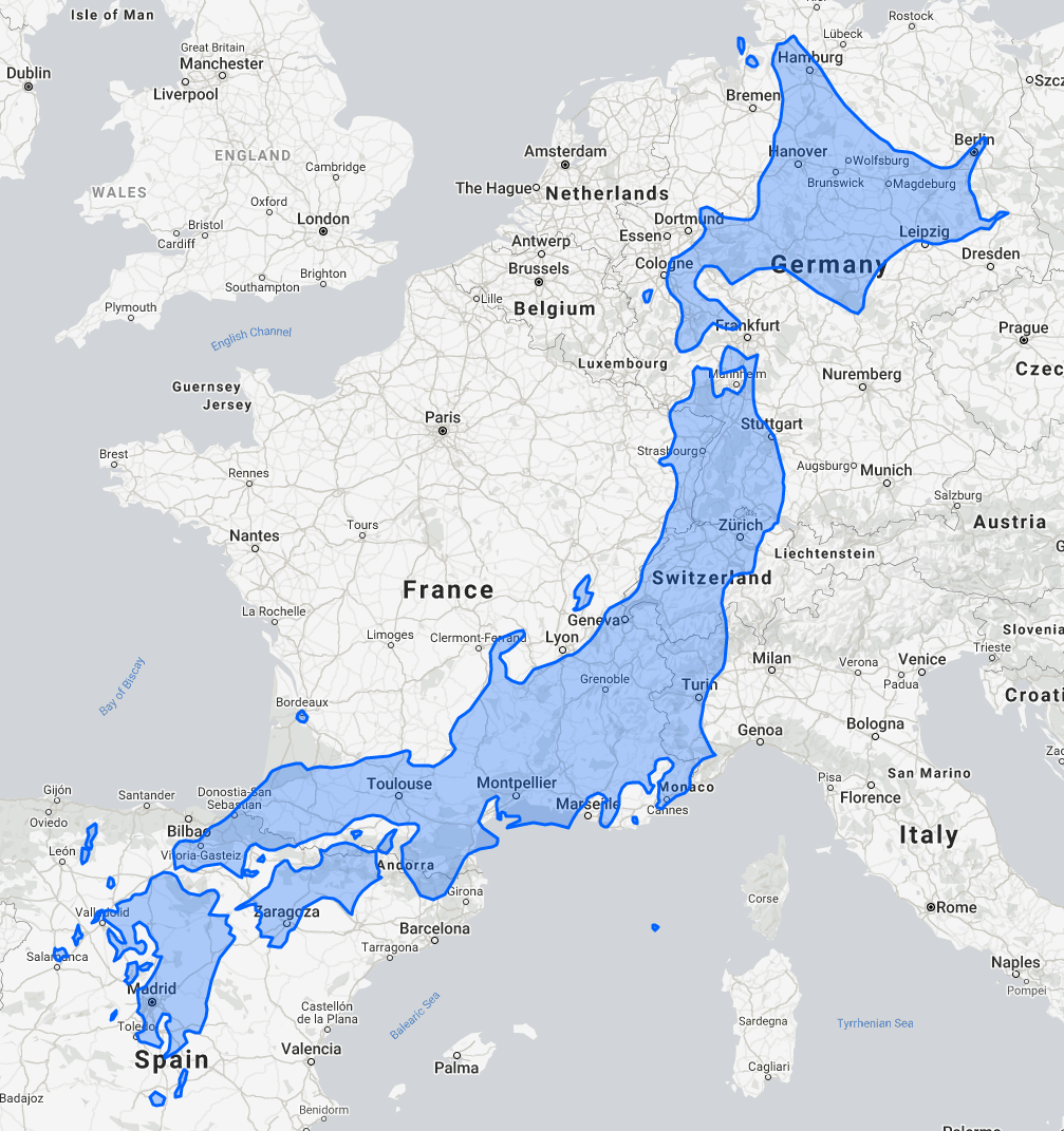 Круче всего смотрится Япония наложенная на западную Европу. Казалось, что там той Японии. А оно вон от Гамбурга до Мадрида.
