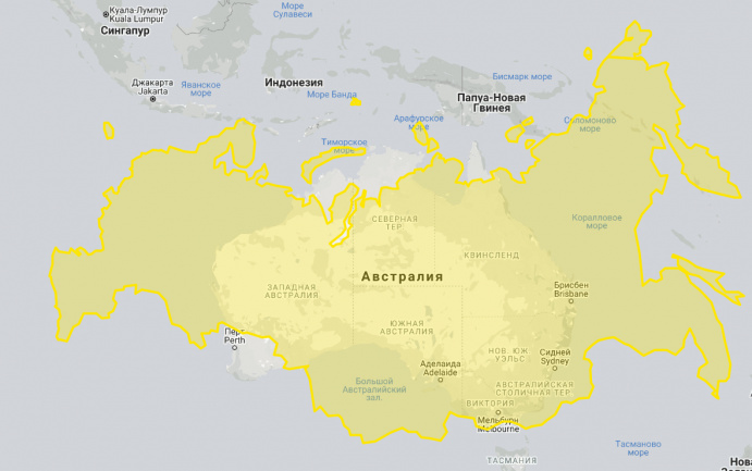 В комментариях сайт очень интересный подсказали. На нем можно задать какую-то страну и наложить ее на другую страну, сравнив реальные размеры. Ведь, как известно, традиционная карта стран реальные размеры совершенно не отражает, там есть серьезные искажения. Вот, например, сравним размеры Австралии и России. Россия кажется больше раз в семь, правильно?