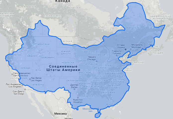 Ну вот фиг знает: размеры России и Китая на схеме в посте различаются процентов на 20, на этой карте - заметно сильнее.