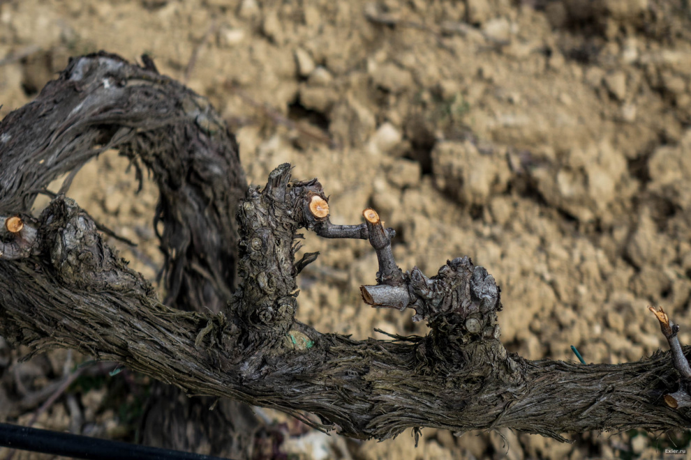 Обрезка лозы. Кстати, изначально это был виноградник с юнибланом - это очень кислый белый виноград, который используется практически только для производства коньяка, вино из него не делают.