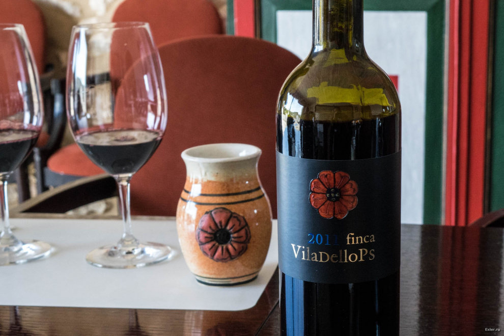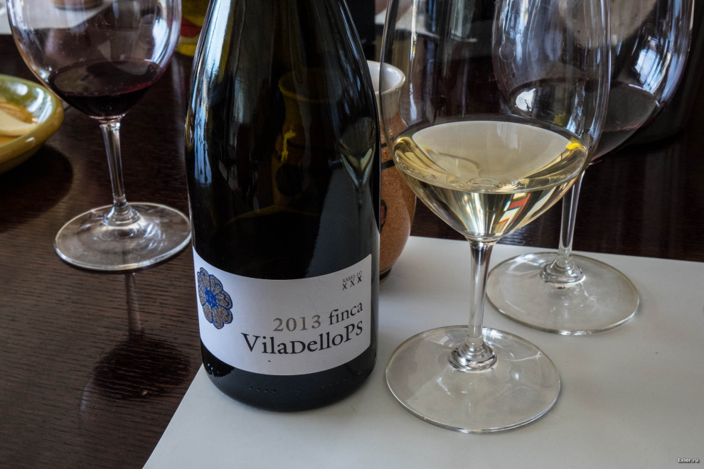 Первым пробовали красное вино, названное так же, как и хозяйство - Finca Viladellops: 70% гранача, 20% сира и 10% марселан. Аромат - вишнево-ежевичный, нотки розмарина и перца. Вкус - полнотелое, мягкое, элегантное, фрукты и перец, приятное послевкусие с ягодными оттенками.