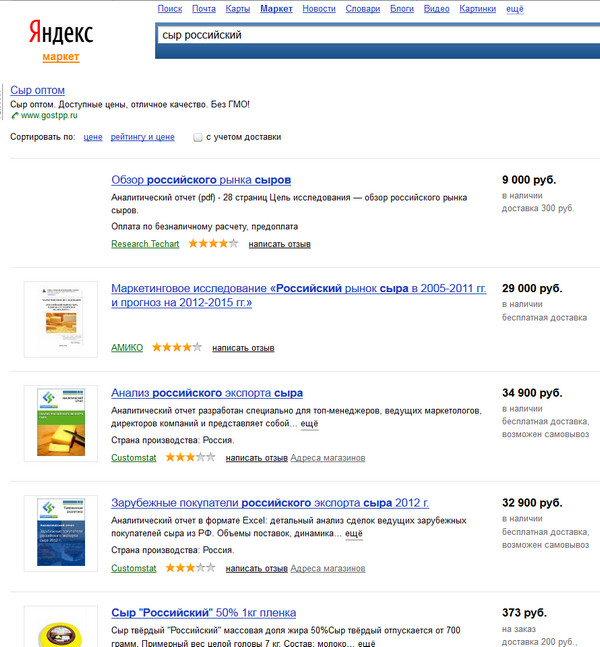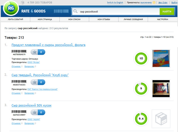 Вот, например, запрос "сыр российский" в Rate&Goods. 213 товаров. По каждому виду есть оценки и отзывы.