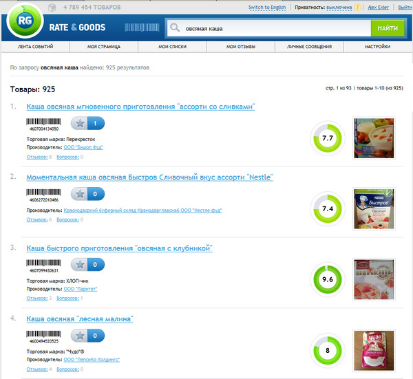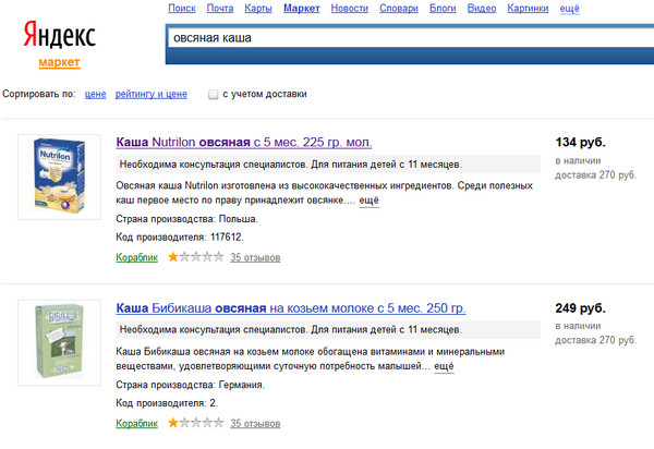 И тут даже когда "Яндекс.Маркет" находит немало товаров по запросу, например, "овсяная каша" (460 результатов), то по каждому конкретному товару просто идет ссылка на магазин, нет ни отзывов, ни рейтингов. (Есть отзывы только на сайт магазина, а не на конкретный товар.)