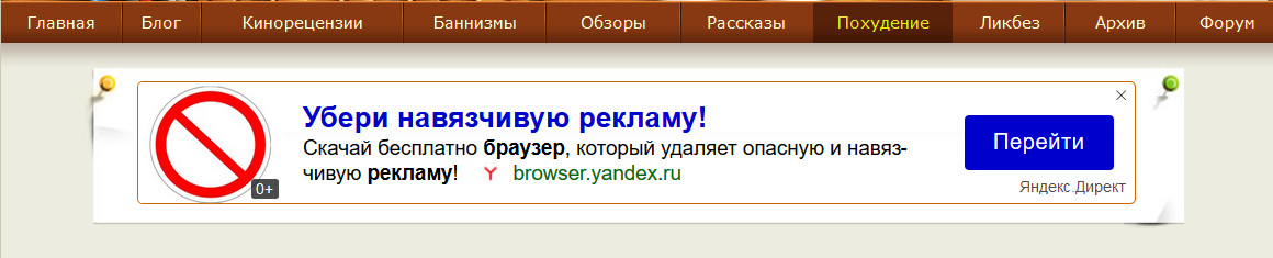 В общем, я попросил админа вообще убрать верхний баннер, где сейчас реклама РСЯ - он даже меня сильно раздражает и я понимаю, как он раздражает посетителей сайта. Он, конечно, самый эффективный, но в топку эффективность с таким убогим контентом. Вернем обратно, когда Adsense разбанит - там хоть все заметно приличнее и блокировки работают.