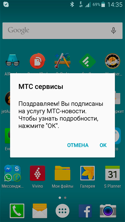 Что значит "поздравляем" и что значит "вы подписаны", спрашиваете вы, потому что вы ни на что не подписывались. Умные люди при этом нажимают "Отмена". Но тогда это сообщение начинает всплывать каждый день, потому что с умными людьми эти твари из МТС тоже умеют справляться.