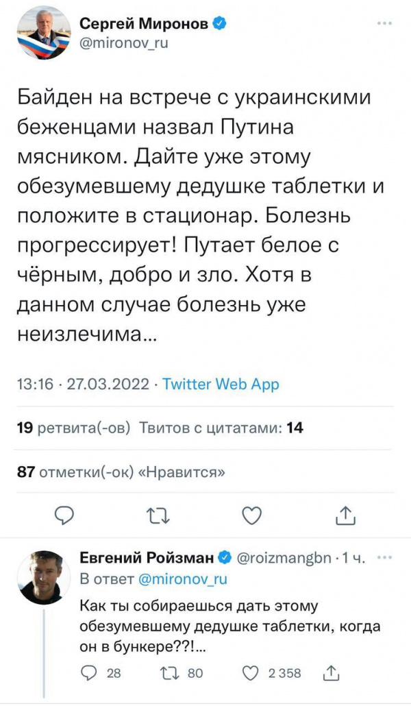 Со временем, гарантировано, выпустят целую подборку твитов и фраз всяких Мироновых, Рогозиных и других преспешников фашизма.