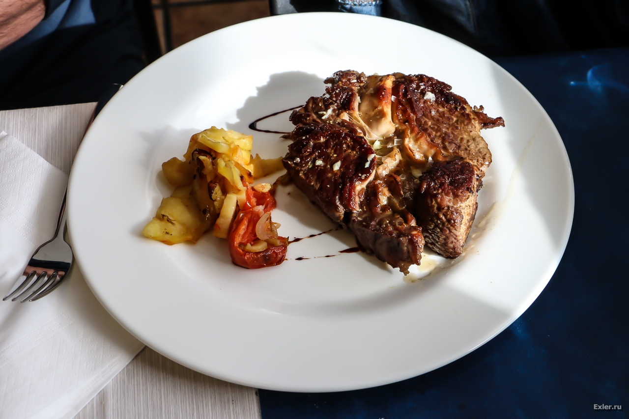 Стейк оказался вкуснейший, на пять баллов, в наших краях я такие никогда не пробовал. Этот стейк (фактически две больших порции) у них стоит 24 евро. За весь обед мы заплатили 82 евро (плюс вода и кофе), и это было более чем обожраться.