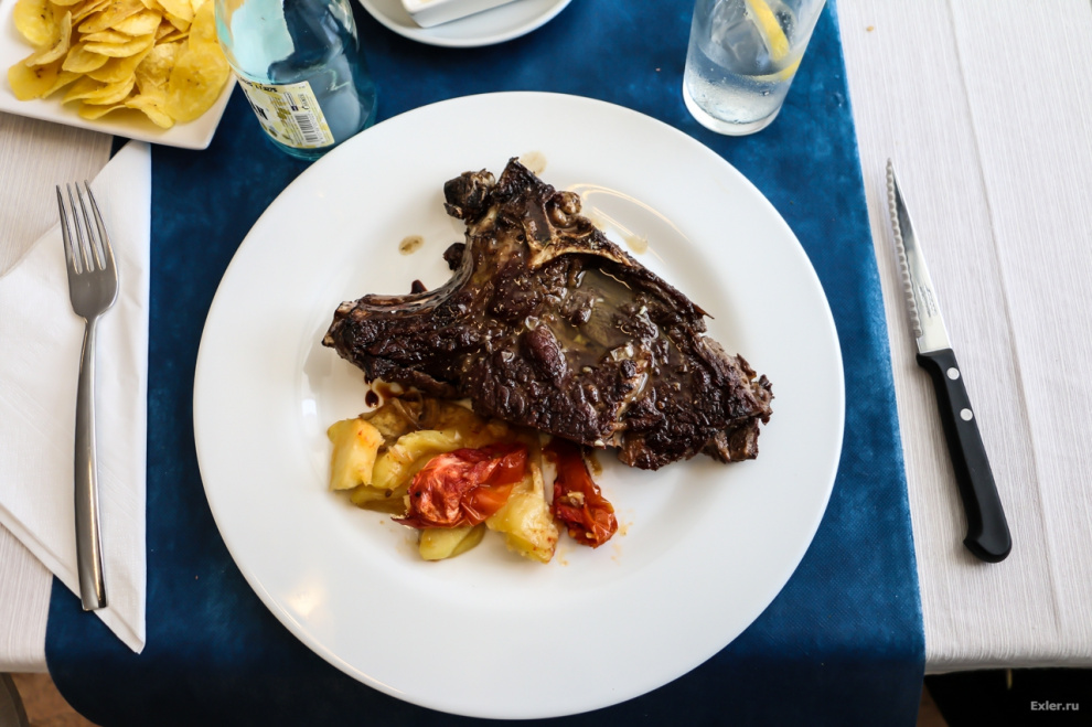 Но Хесус сказал, что также очень рекомендует попробовать их фирменный стейк, который здесь именуется чулетон (chuletón). Нас терзали смутные сомнения, да и наелись морепродуктами, но так как блогер должен все стойко испытывать на себе, пришлось заказывать стейк. Попросили один на двоих - на двух мужиков. (Мы ездили со Старым Каталаном™.)