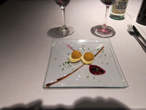 Сначала пошли закусочки. Это комплимент от шефа. Два глазика и широкая брусничная улыбка. За ними скрывается фуа-гра с человеческим лицом.