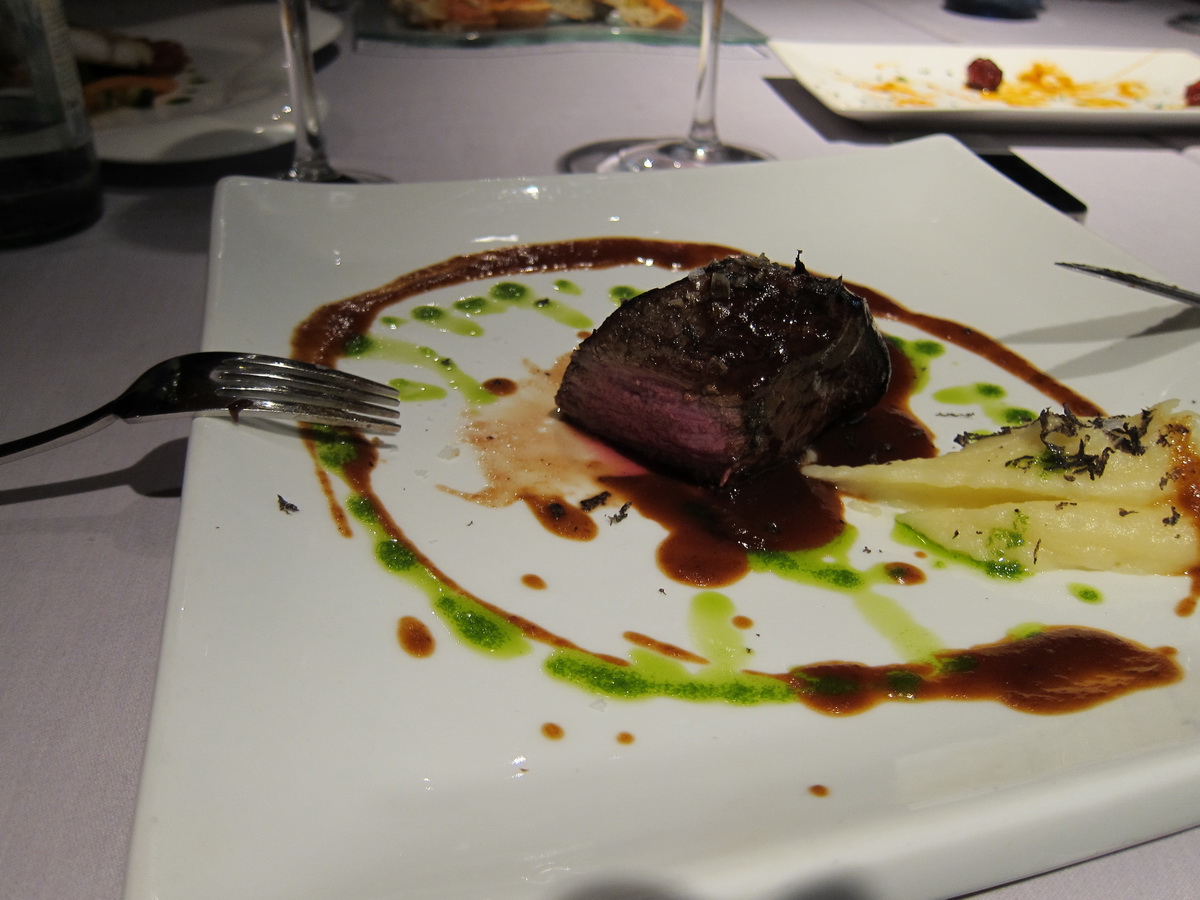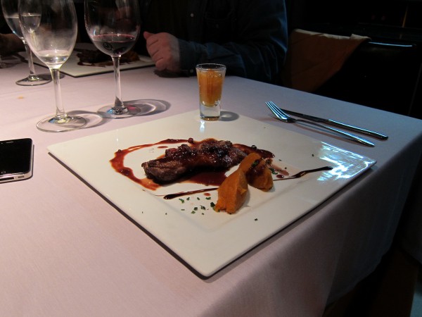 Добрались до мяса. Вот это я не помню что (жена себе заказывала) с брусничным соусом. Сказала, что здорово. Вроде утиная грудка магрэ.