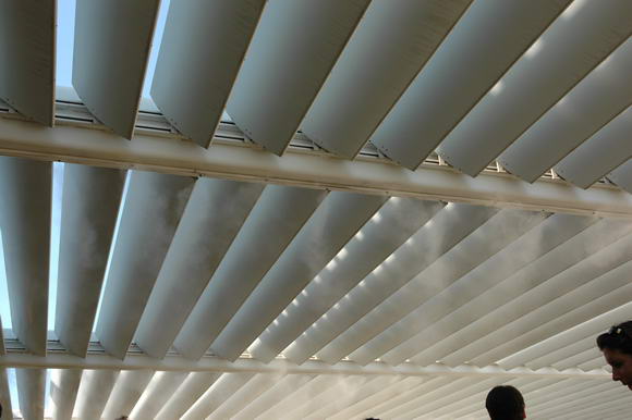 В солнечной Калифорнии недалеко от города Barstow (кажись так) есть аутлет под названием Tanger (подлые америкашки:) произносят это как Тангер). Так там по периметру здания стоят дюзы из которых без остановки идет холодный пар. Но в той местности днем и пары минут на открытом месте не простоять.