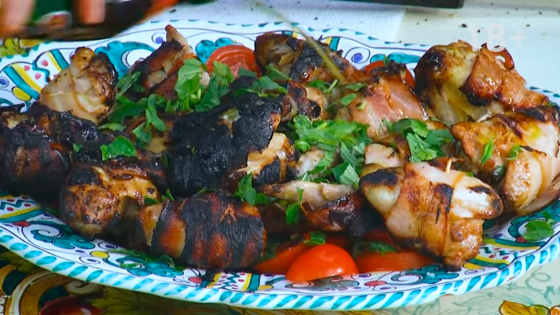 Нафигачить побольше сахара чтобы он сгорел. Зачем-то и без того жирную куриную кожу завернуть в жирный бекон... Жарить на открытом пламени.