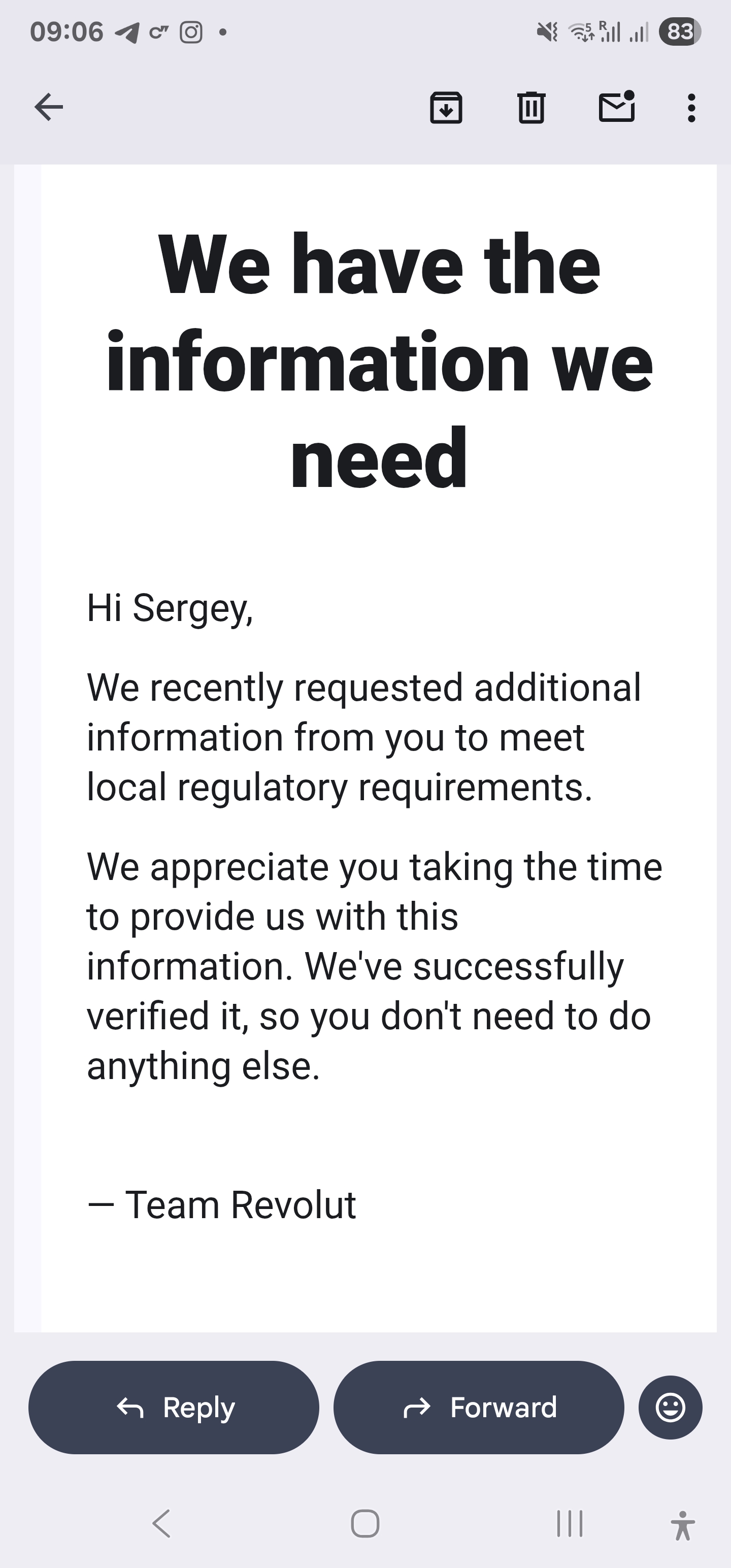 Тоже пришли "письма счастья", про 19-й пакет санкций и про закрытие счета 31 декабря. Приложил им справку, что продление моего ВНЖ в рассмотрении, написали, что все ок и угрожающая надпись в приложении пропала. У всех моих знакомых прошло точно так же. Чтобы закрытие счета произошло немедленно после отправки первого письма, слышал, но подтвержденных кейсов не знаю. Видимо, тогда писать в поддержку.