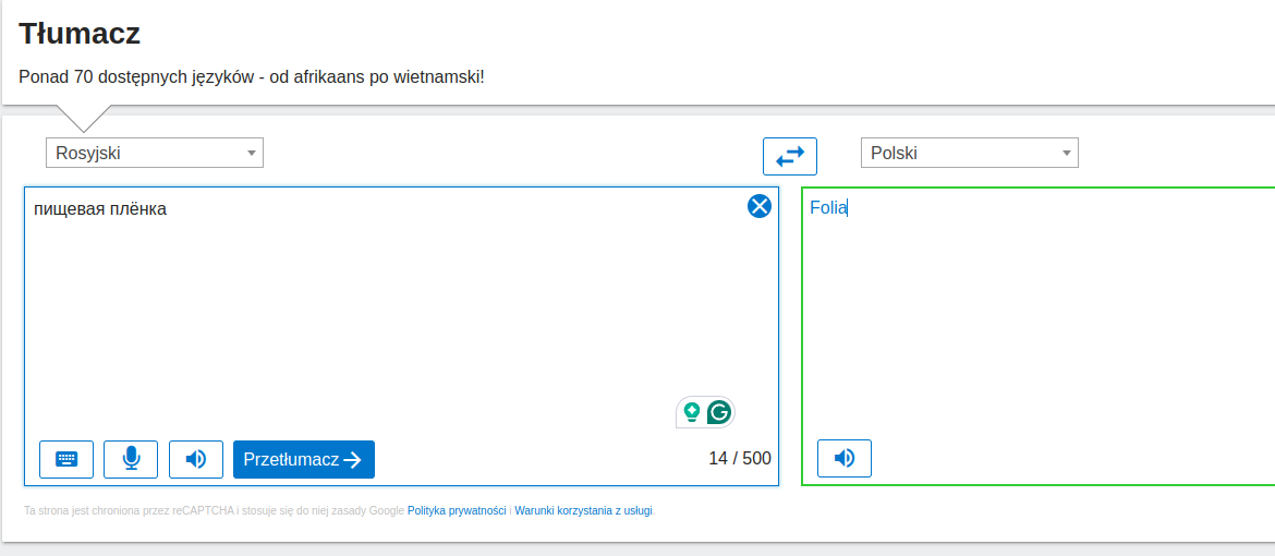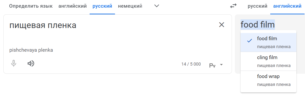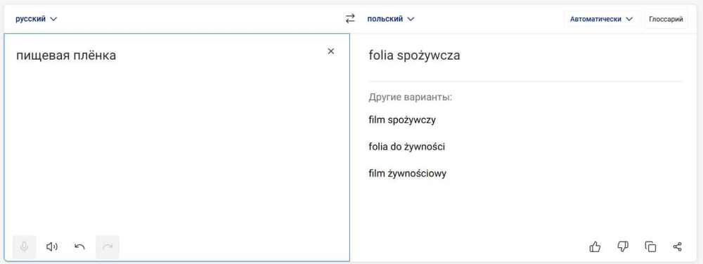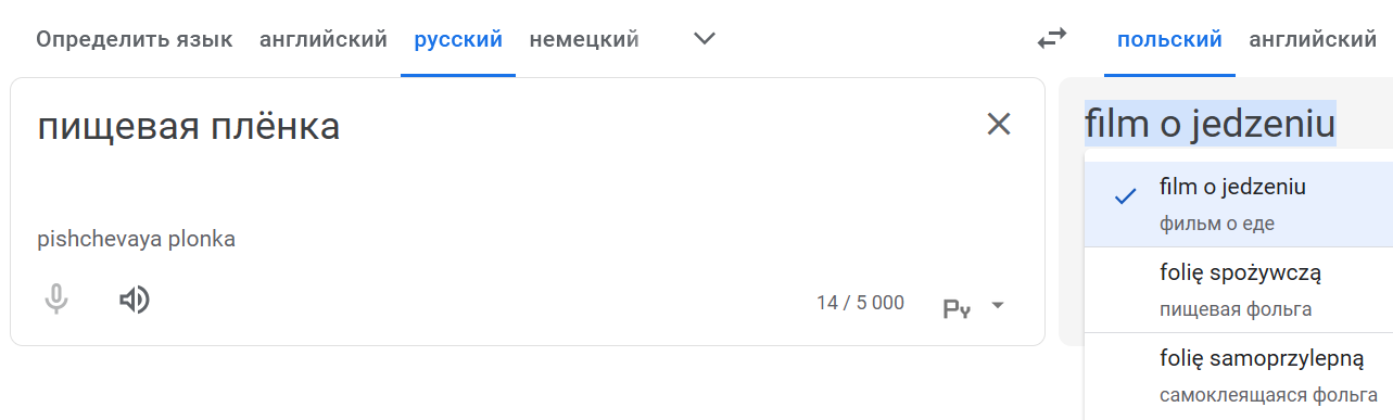 Да Гугл-переводчик мне только что на запрос «пищевая плёнка» выдал «film o jedzeniu» («фильм о еде»), о чем тут вообще можно говорить, это даже переводчиком назвать сложно.