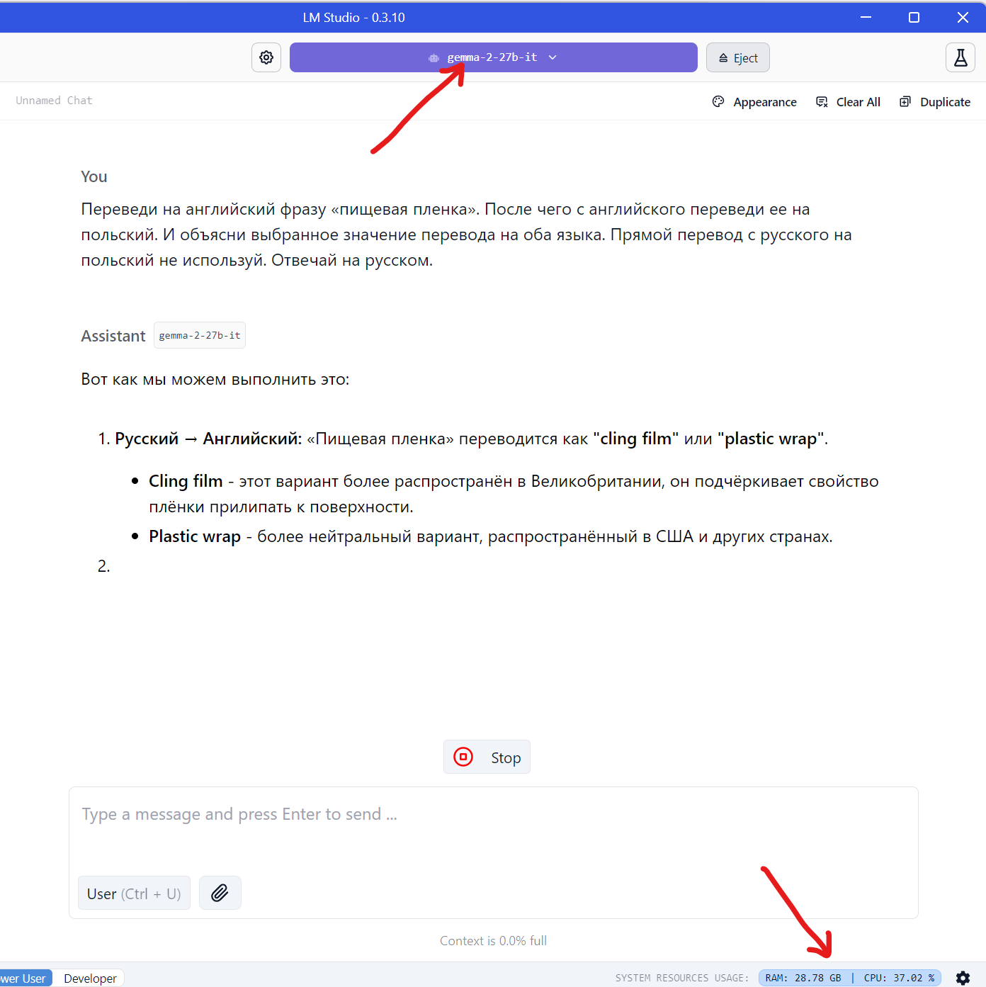 upd: у меня нет 110 Gb ОЗУ для полноценной Gemma 2, поэтому я запустил квантованную (gemma-2-27b-it-Q8_0.gguf). На скриншоте можно посмотреть потребление. Скорость ответа — чуть больше двух токенов в секунду. Это где-то минута на абзац.