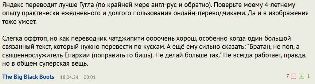 Не надо спорить о вкусе устриц с теми, кто их ел. Я Переводчик Яндекса регулярно пользую, чтобы в очередной раз убедиться в тупости этого "сервиса". Больше всего мне понравилось, как это "изделие" перевело английское phones (наушники). По версии Яндекса это называется "фоны".
