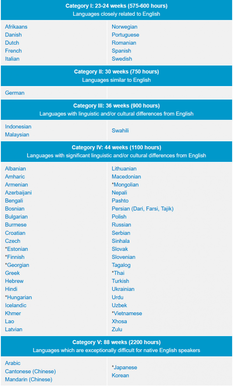 Институт дипломатической службы (FSI) составил список, в котором указано приблизительное время, необходимое для изучения определенного языка носителям английского. По окончании этого времени обучения вы достигнете уровня «Разговорная речь 3: общепрофессиональное владение устной речью (S3)» и «Чтение 3: общепрофессиональное владение чтением (R3)».