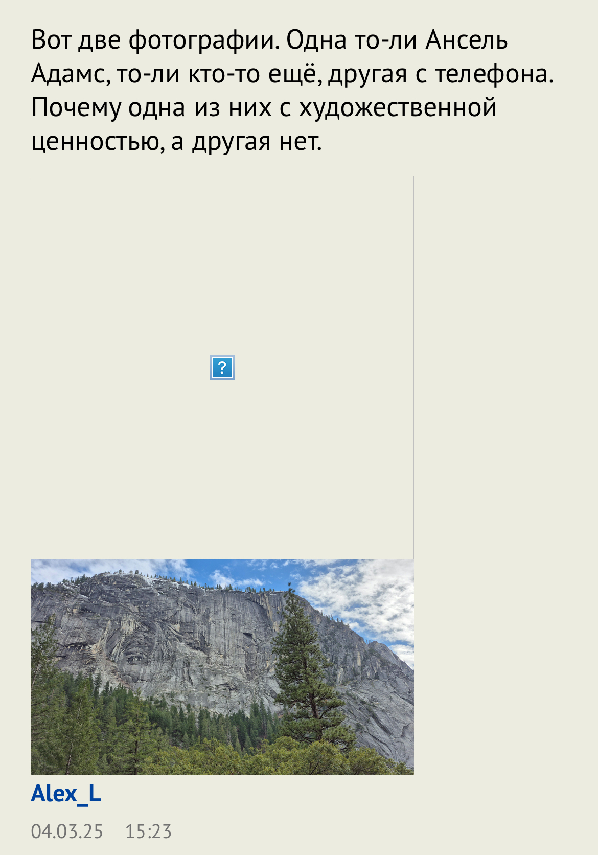 Вот две фотографии. Одна то-ли Ансель Адамс, то-ли кто-то ещё, другая с телефона. Почему одна из них с художественной ценностью, а другая нет.