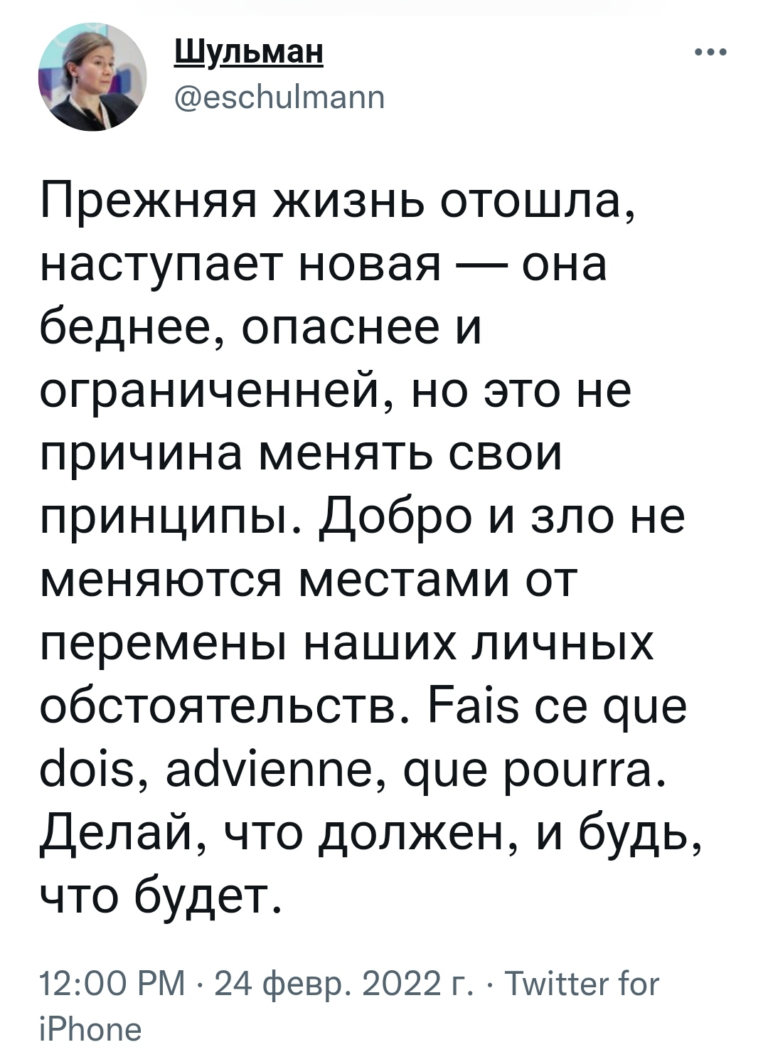 Второе — есть священный принцип: не принимать решения из точки паники. Они всегда будут ошибочными. В некотором роде все, что собиралось произойти, уже произошло. Нам, тем, кто не вовлечен активно в этот процесс управления войной, остается только ждать.