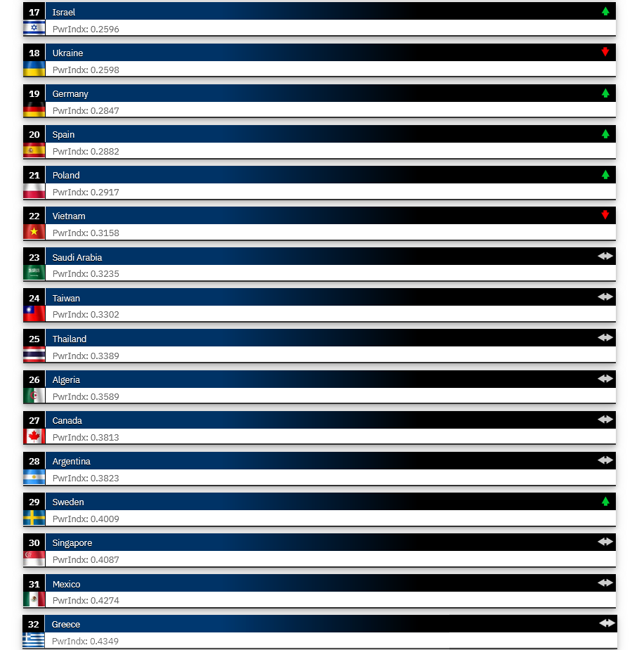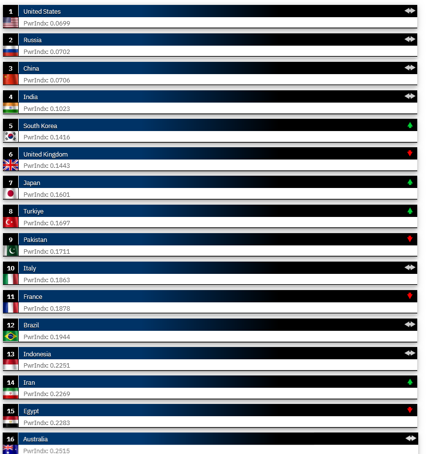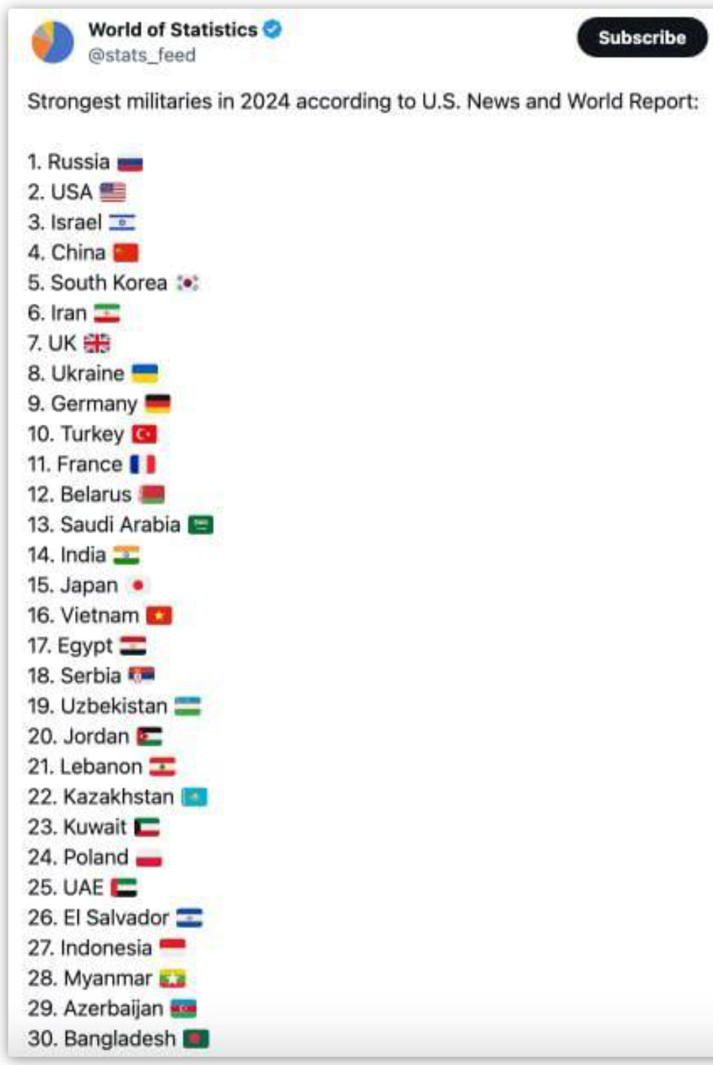 Человечество любит фуями меряться. И если в конкурсе пинания мяча ногами или конкурсе битья руками по лицу есть какой то смысл, интерес и финансовая выгода, а также правила просты и понятны и легко определяется кто сильнее или быстрее,то все эти рейтинг систем образования,здравоохранения и у кого корупция сильнее бесполезны и зависят от методолгий сравнения. Сравнивать армии может только тупой,ленивый и необразованый урод.Задача армии решать политические задачи руководства,путём убийства как можно больше "чужих" человеков,паралельно разрушая инфраструктуру. Так что они утверждает,что Израиль убьёт больше Турок чем турки израильтян и Эрдуан вдруг нас полюбит? Ага ,щас. Все эти рейтинги армий туфта полная и больше подходит для тик токеров 16 летних, а не для газеты.Хотя кто то уже написал,что это газета - помойка