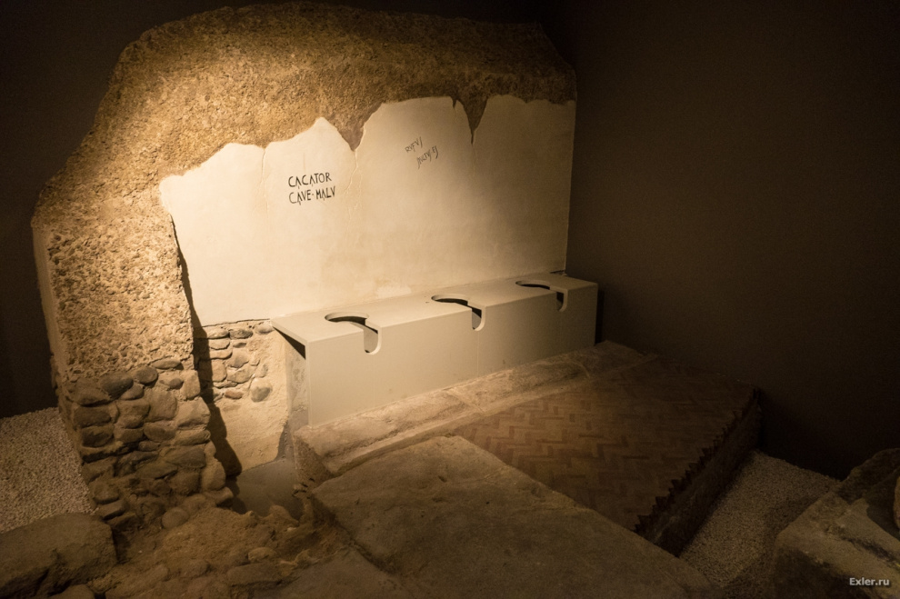Туалет при терме. С надписями, как полагается для туалета. В оригинале там был большой прямоугольный зал с десятками таких сидушек. Римляне любили пообщаться и во время этого интимного занятия. Они не считали его интимным.