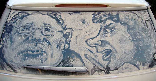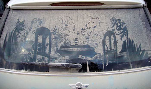 По Рунету одно время долго гуляла фотография "Газели", на грязном боку которой была нарисована целая деревня. Говорили, правда, что это не рисунок, а наклейка. Безотносительно к, вот ссылка на сайт художника по имени Scott Wade, который действительно рисует на задних грязных стеклах автомашин. Вот галерея рисунков. Некоторые из них - просто блеск, полюбуйтесь на несколько примеров: