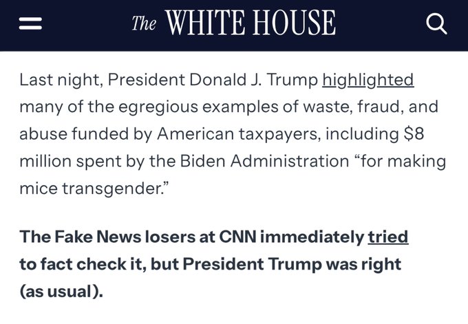 Last night, President Donald J. Trump highlighted many of the egregious examples of waste, fraud, and abuse funded by American taxpayers, including $8 million spent by the Biden Administration “for making mice transgender.”