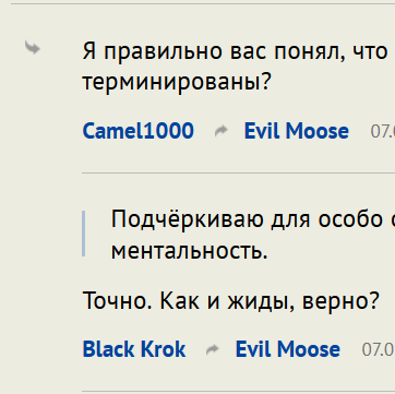 P.S. Подчёркиваю для особо одарённых - руский это не нация, а ментальность. Software, так сказать, даже, наверное, вирус для платформы Homo. И эту заразу крайне важно с планеты вычистить, иначе она сожрёт все ресурсы, сломает всю технику и обнулит интеллект у заражённых, после чего носители сдохнут частично перебив друг друга в очередях за просрочкой, боярой и валежником, частично утонув в очковых сортирах производства корпорации РосКозМоС (Росийский Козаче-Мотоциклетный Союз, и да, такие уже есть в реальности, гуглите), остальные просто от голода и подорожниково-уринотерапевтической медицины.