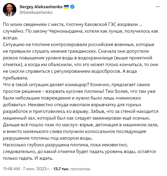 "Версию о том, что, мол, ВСУ сами разбомбили Каховскую ГЭС (захваченную, заметим, российскими войсками) - даже и обсуждать смысла нет, она предназначена только для законченных кретинов, то есть для традиционной аудитории Соловьева. "