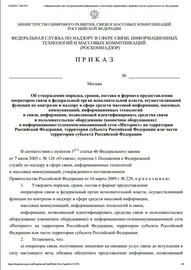 Детали. Согласно проекту приказа, операторы связи должны будут передавать в Роскомнадзор информацию, позволяющую «идентифицировать средства связи и пользовательское оборудование». Служба будет использовать эти данные для «выявления интернет-трафика, обеспечивающего доступ к противоправным интернет-ресурсам, для последующего ограничения доступа к ним», говорится в пояснительной записке.