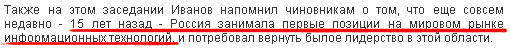 А Иванов, друзья мои, что к оборонке, что к IT, что теперь вообще к политике имеет весьма слабое отношение имхо.а речь его - это перл на перле, не иначе у Черномырдина учился. И вообще, Алекс - Вы все серьезно воспринимаете, а зря - оставьте этот топик Шендеровичу!!! 😉