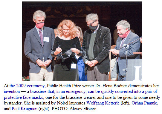 Нобелевский лауреат Елена Боднар и другие нобелевские лауреаты демонстрируют инновационную разработку: лифчик, который при необходимости превращается в защитную маску.