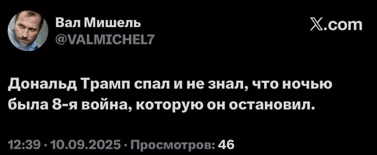 В НАТО, конечно, выразили озабоченность. Американский конгрессмен Джо Уилсон заявил, что это акт войны, призвал Трампа немедленно ответить и заявил, что "свободные и процветающие страны научат Россию, что такое границы". Я думаю, что нам следует ждать от НАТО меморандума по этому поводу. И я считаю, что Трамп должен немедленно дать Путину две недели на то, чтобы он перестал засылать в Польшу дроны.