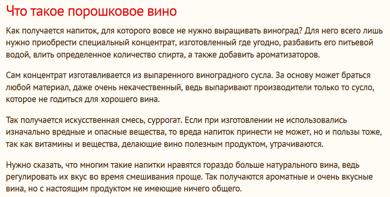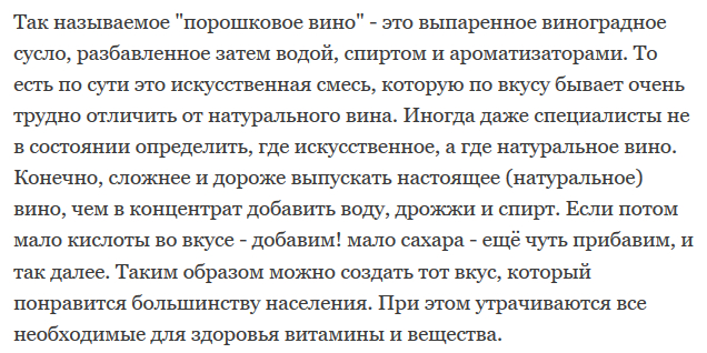 Мне кажется, что в статьях про то, что порошкового вина не существует, нужно добавить ещё вот что: что то, что куплено в нормальном магазине и на чём написано "вино" - это натуральное вино, хотя его качество - это уже другой вопрос.