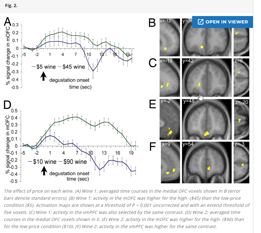 Результаты показали, что увеличение цены вина повышает субъективные оценки приятности вкуса, а также активность, зависящую от уровня кислорода в крови, в медиальной орбитофронтальной коре - области, которая, как принято считать, кодирует приятность вкуса в ходе выполнения экспериментальных задач. В статье приводятся доказательства способности маркетинговых акций модулировать нейронные корреляты приятности вкуса и механизмы, через которые этот эффект действует.
