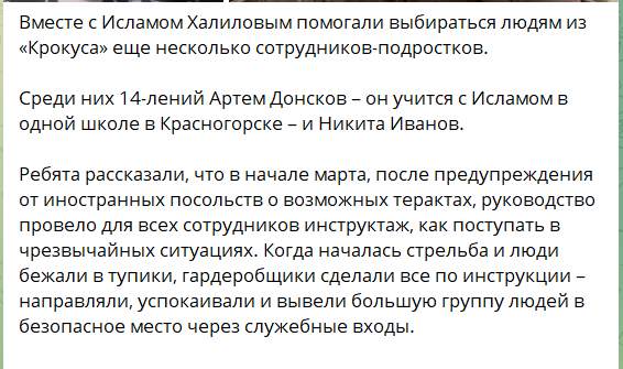 В "Крокусе" трое подрабатывавших мальчишек-гардеробщиков (по 14 лет каждому) спасли более сотни людей - это на порядок больше,