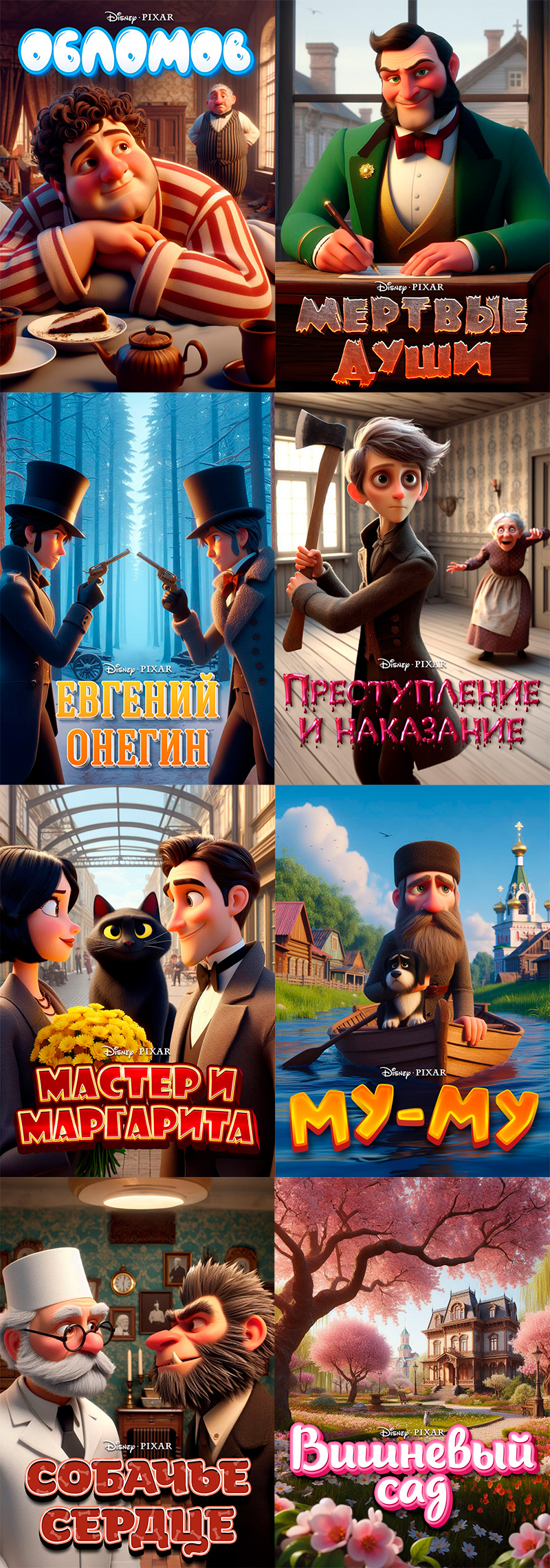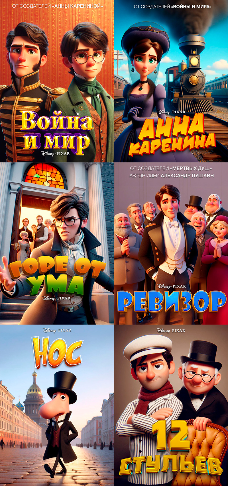 В ТГ "Джимми Нейрон" - русская литературная классика в стиле Pixar (я бы даже сказал - по стилю ближе к Disney, а не к Pixar). Как пишет сам автор, это сделано с помощью Dalle-3 + много "Фотошопа".