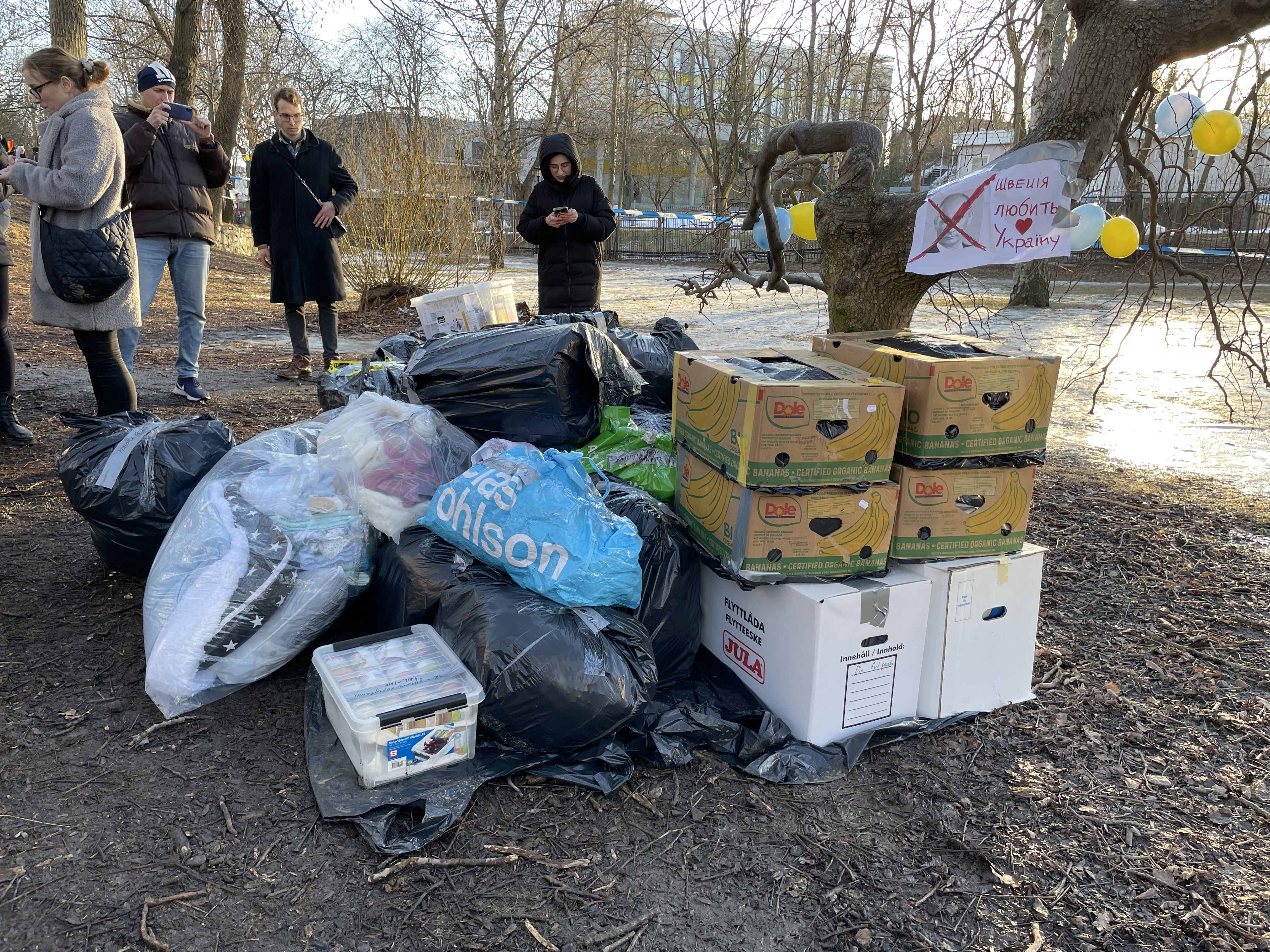 А я немножко скажу за Стокгольм. Сегодня отправили фургон медикаментов и детского питания в Украину. Сбор организован в сквере рядом с российским посольством.