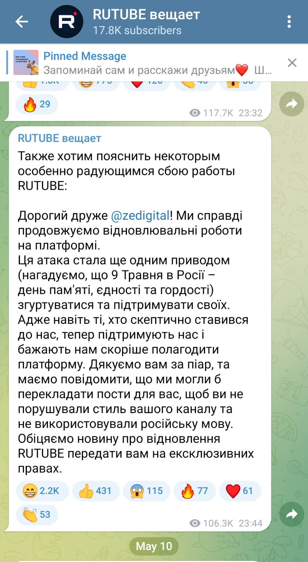 UPD. Сегодня утром в программе Плющева Григорий Бакунов предположил, что рутуб могли создавать на аутсорсе с привлечением украинских программистов, у которых остался доступ, и они это всё устроили.