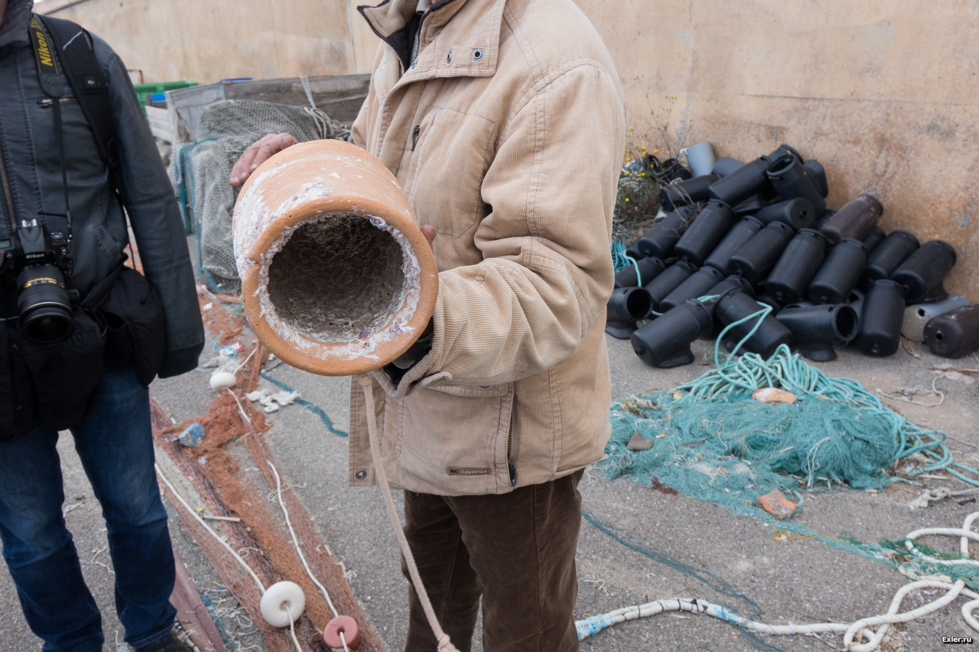 Раньше их зарывали в песок на мелководье: осьминоги находили эти сосуды (за спиной Уго - пластиковые сосуды того же назначения) и устраивали себе там жилье, законопачивая выход раковинами моллюсков, которыми они питаются. Далее оставалось достать эту ловушку с осьминогом, капнуть ему на задницу лимонным соком - осьминог оттуда и выползал.