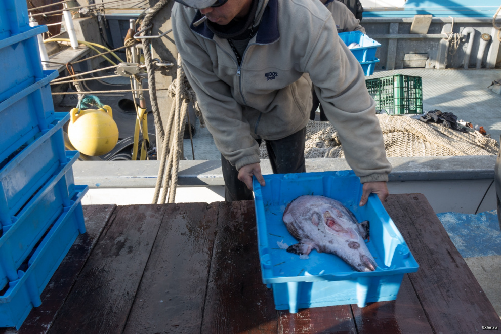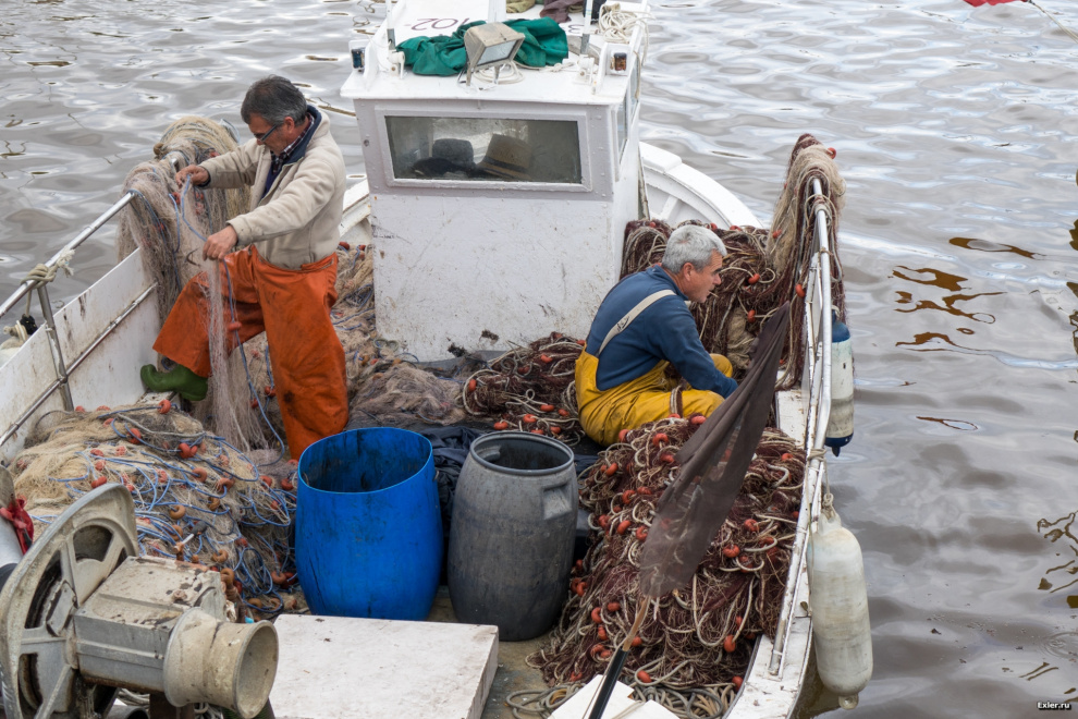Alex Exler: Вот так производится разбор улова из сетей. Сначала рыбаки выходят в море, проходят сетями определенное расстояние на определенной глубине, возвращаются в порт, после чего начинается разбор пойманного.