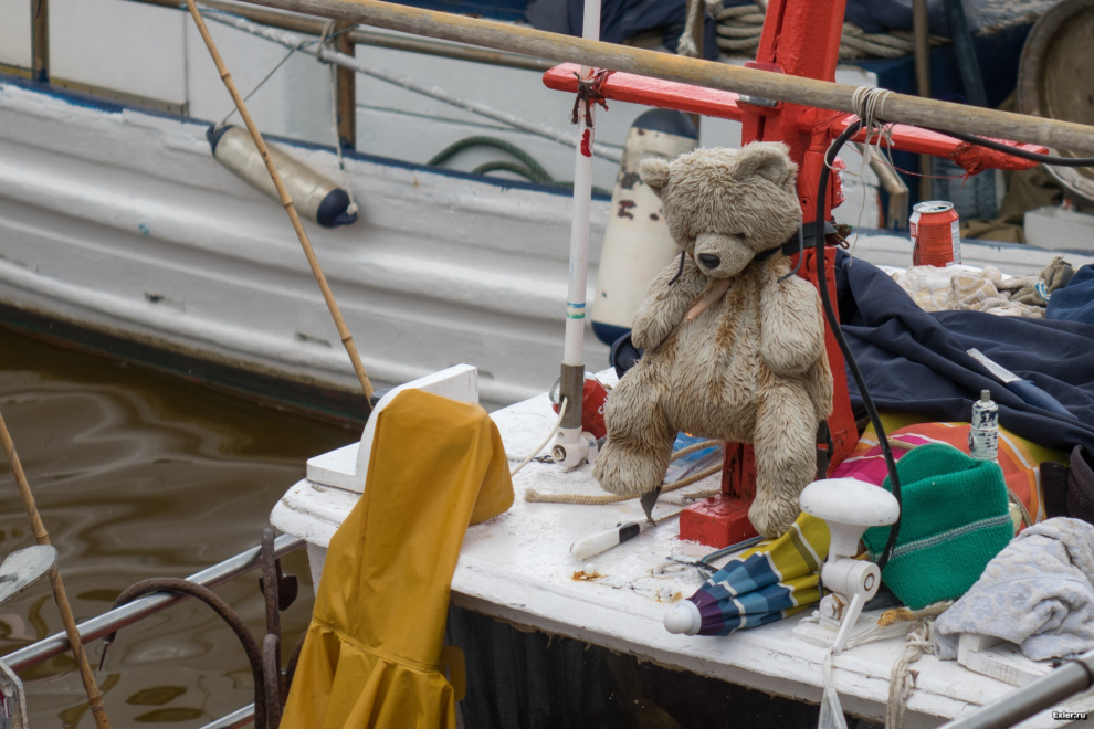 На одном из баркасов встретился вот такой грустный талисман: если мишка проснется утром и увидит свою тень - хек не будет ловиться шесть недель.