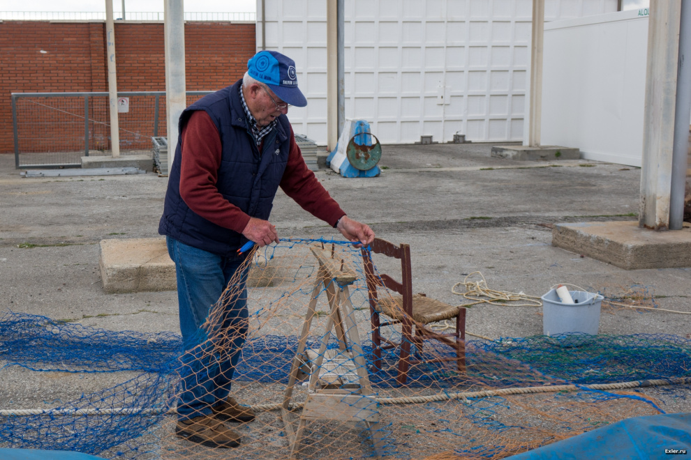 Дедушка Жозеп чинит сети. Сети постоянно приходится чинить - они рвутся, когда задевают за камни. Этим занимаются и сами рыбаки после ловли, и рыбаки-пенсионеры, которые уже не выходят в море, но им хочется хоть как-то работать в порту.