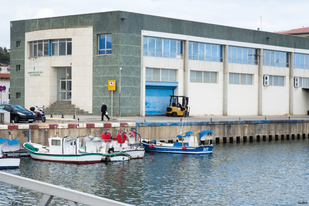 После этого мы сели в прогулочный катерок Уго (он не только ловит рыбу, но устраивает выезды в море туристам - на рыбную ловлю, купание, экскурсии) и покатались по порту и бухте. Вот причал и здание биржи.
