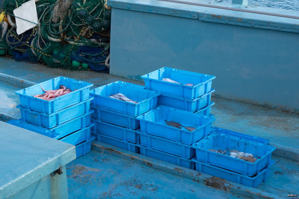 Потом обычная промысловая рыба: обратите внимание, что в каждом контейнере лежит строго определенный вид рыбы или морепродуктов - их сортируют прямо в процессе лова.