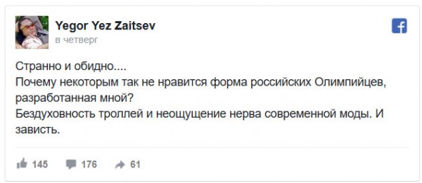 Так вот кто эту официантскую форму-то для олимпийцев сотворил. Большой, понимаешь, кутюрье. Титаник моды. Но кисо обиделось. И будет, как вы понимаете, сетовать на бездуховность, неощущение нерва современной моды, едреныть. Ну и банальная зависть к этой бездари, кто б сомневался.